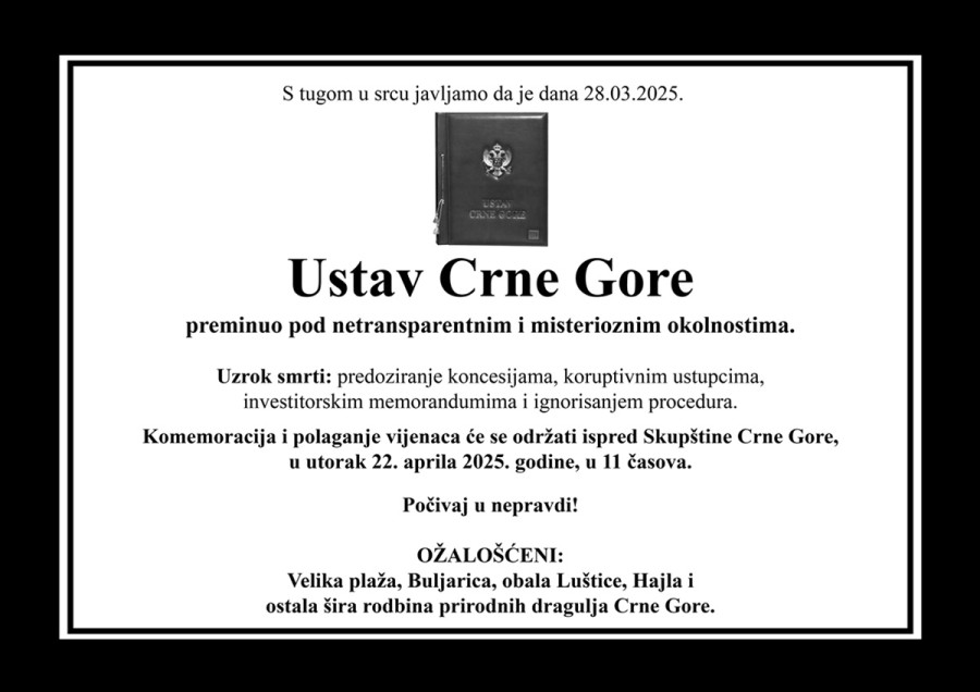 Группа из 18 неправительственных организаций планирует сегодня в 11:00 провести перформанс у здания парламента в Подгорице, чтобы выступить против соглашения с ОАЭ, которое, по их мнению, угрожает суверенитету страны, ее законам и природным ресурсам. Во время акции состоится символическая панихида по Конституции Черногории.