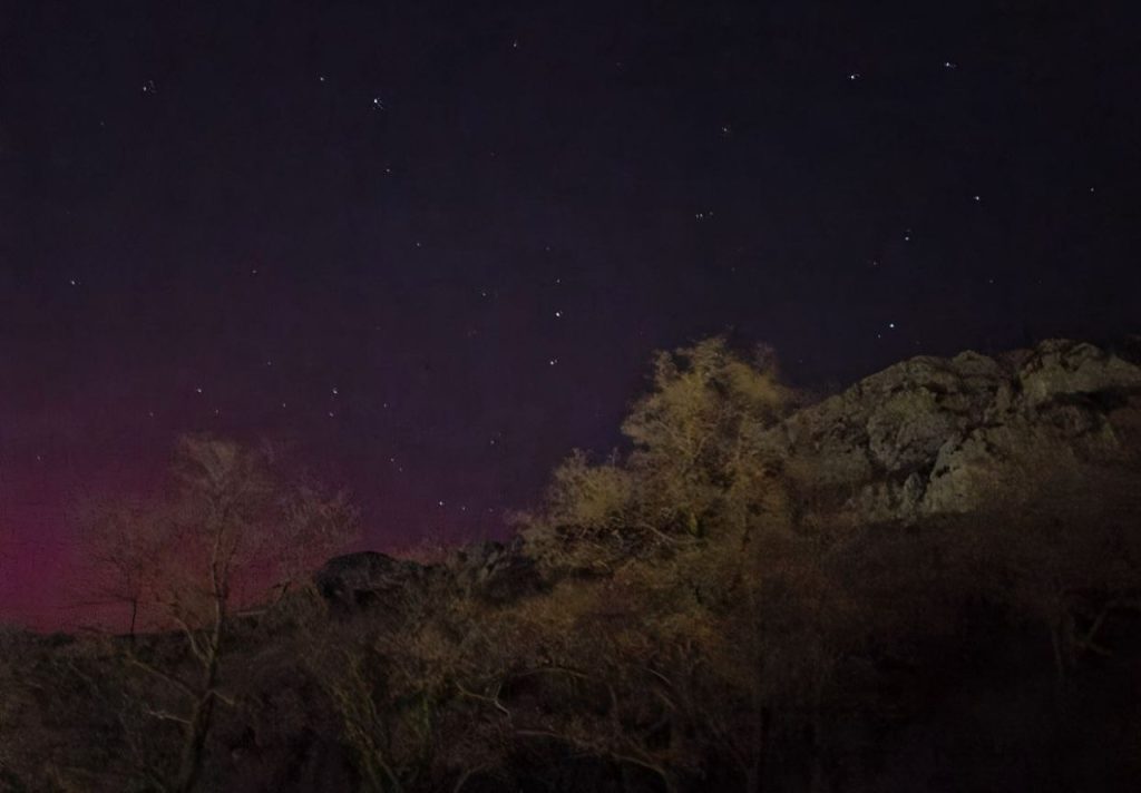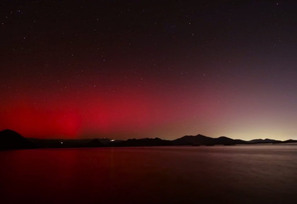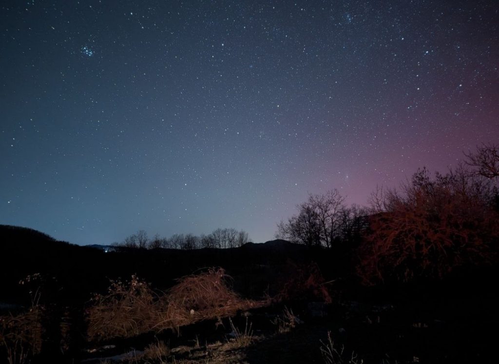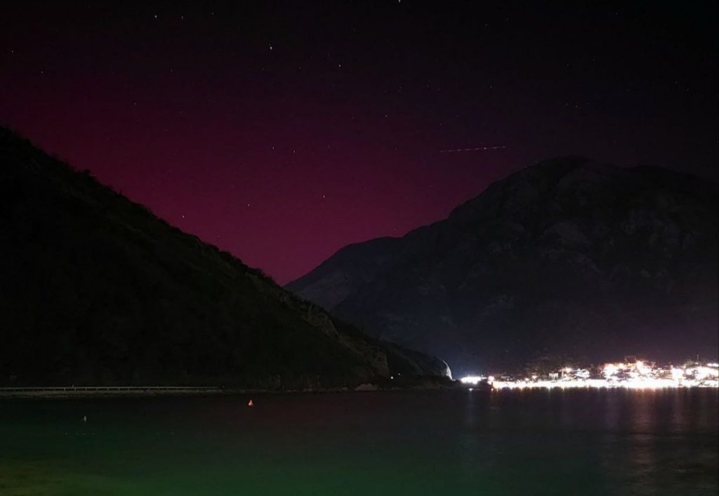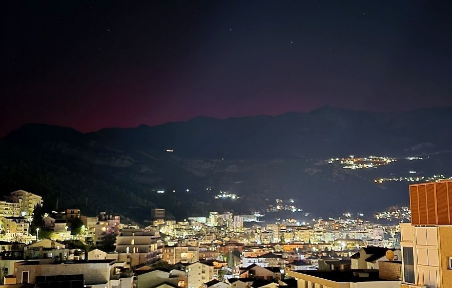 Пользователи сети поделились кадрами северного сияния, которое наблюдали вчера вечером в небе над Черногорией. Ученые объясняют явление мощной вспышкой на Солнце, достигшей максимального класса X1.95.
