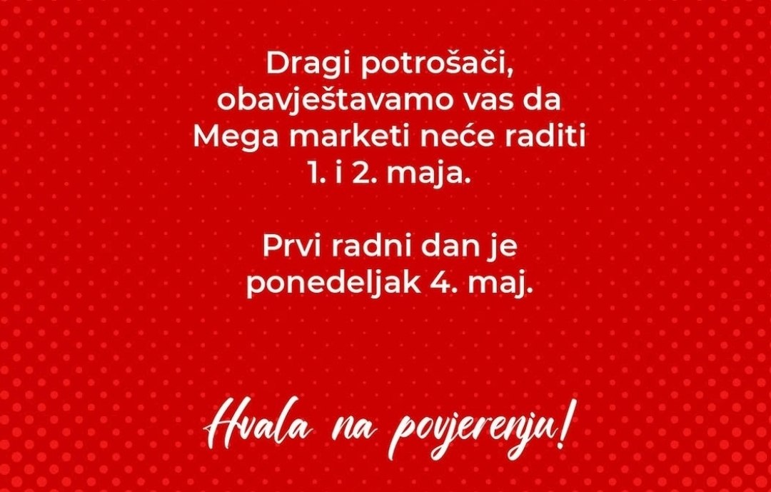 Крупные торговые сети Черногории предупреждают, что 1 и 2 мая объявлены нерабочими днями и призывают заранее совершить необходимые покупки. Первым рабочим днем станет 4 мая, следующий после воскресенья.
